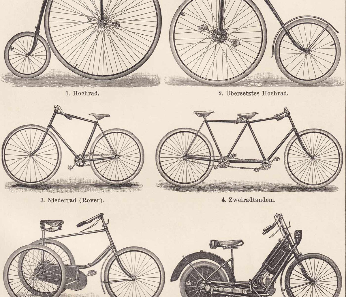 Meyers Konversations Lexikon · 1894 · Dettagliata stampa vintage di biciclette ottocentesche con linee nere nitide