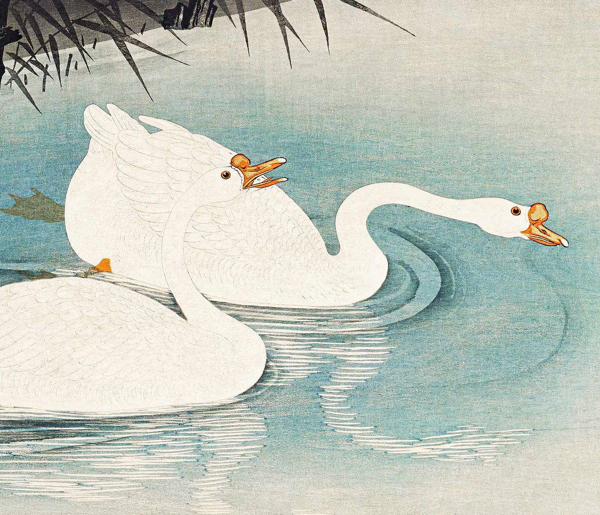 Ohara Koson · 1928 · Serene wildlife print of two white geese gliding beside reeds on calm water