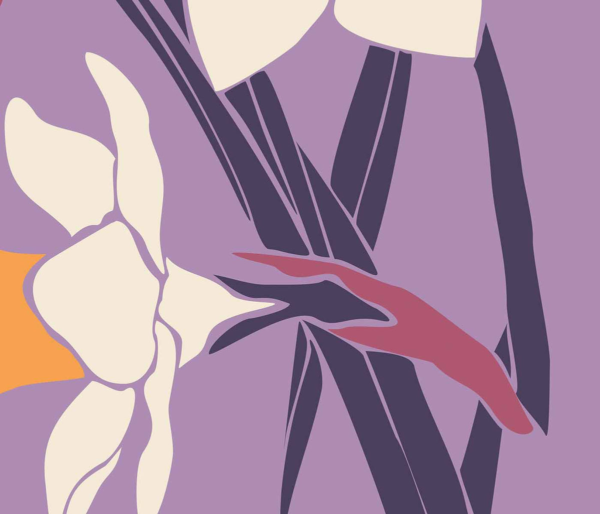 MORYARTY · 2021 · Poster floreale vivace con campo arancione e fiori grafici rosa e viola